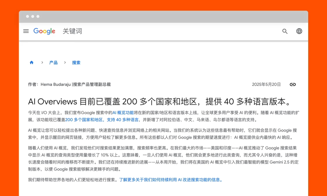 2025年5月20日,Google 宣布搜索中的AI 概览功能将在新的国家/地区和语言版本上线,让全球更多用户享受 AI 的便利,该功能现已覆盖200 多个国家和地区,支持 40 多种语言。